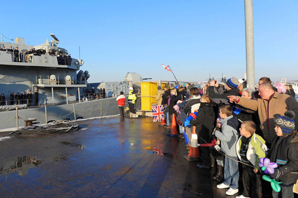The crew were welcomed to their base-port of HM Naval Base Devonport by a cheering crowd of families and friends after an action-packed deployment. The party atmosphere was completed by families being given gifts and children entertained while accompanied by Her Majesty’s Band of the Royal Marines.