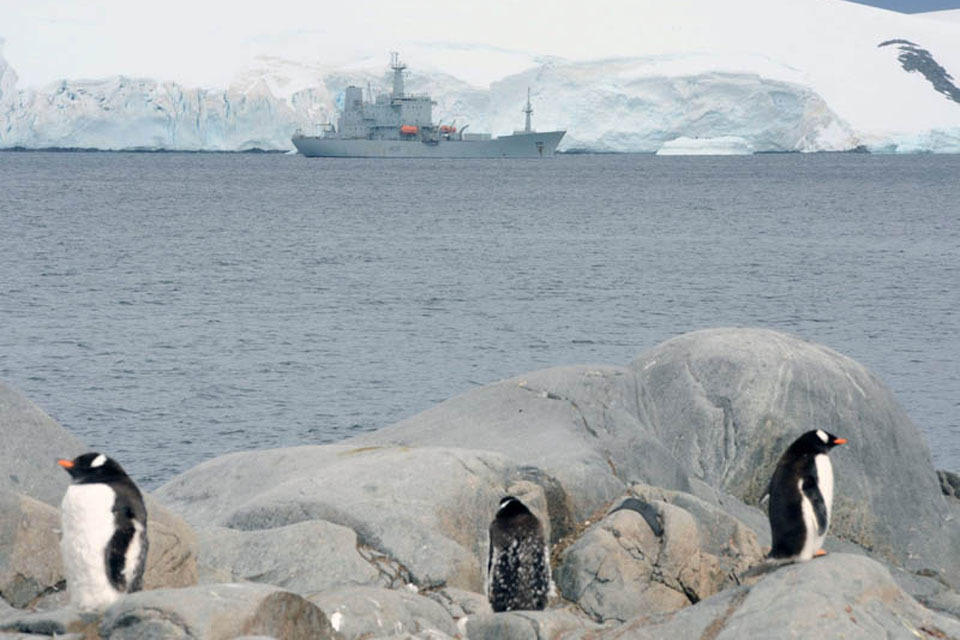 Penguins stand sentry as HMS Scott visits Port Lockroy during her last Antarctic deployment [Picture: Petty Officer Airman (Photographer) Ray Jones, Crown Copyright/MOD 2011]