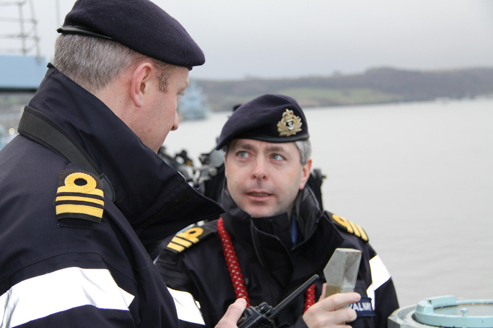 HMS Somerset's commanding officer, Commander Mike Smith (right), speaks with a lieutenant commander [Picture: Leading Airman (Photographer) Joel Rouse, Crown Copyright/MOD 2013]