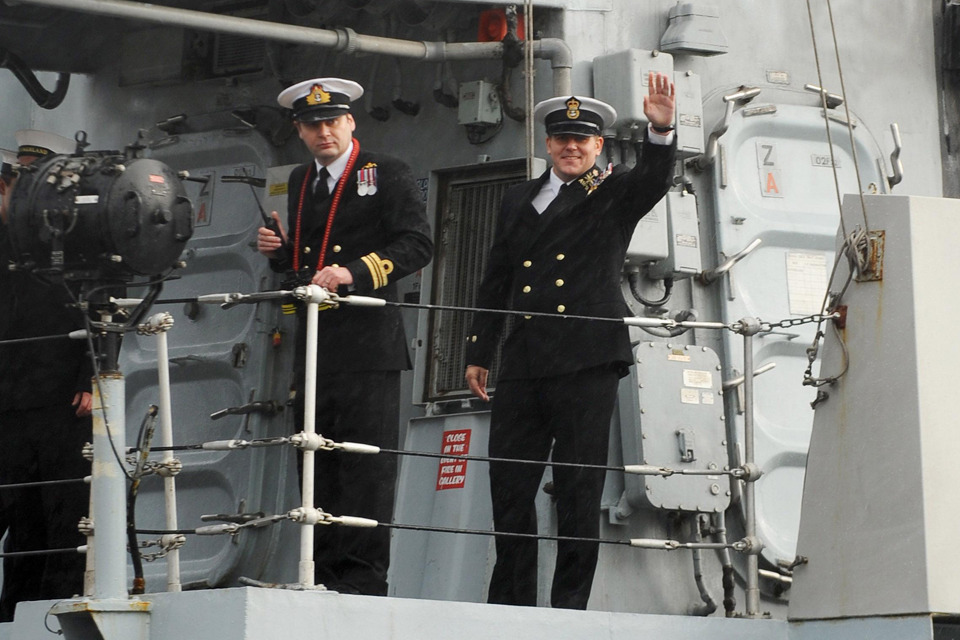 A Petty Officer on board HMS Sutherland waves to the waiting families on the dockside as the ship comes into port [Picture: Leading Airman (Photographer) Vicki Benwell, Crown Copyright/MOD 2012]