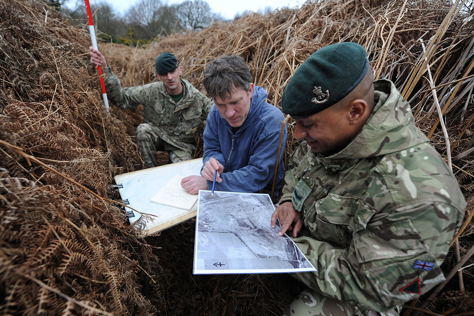 Richard Osgood (centre) and Lance Corporal Robert Waters (right) making notes in one of the newly-discovered First World War practice trenches [Picture: Shane Wilkinson, Crown copyright]