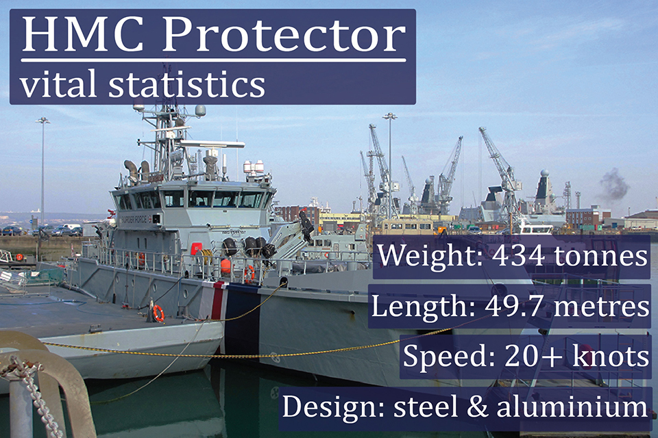 HMC Protector is 1 of 5 cutters operated by Border Force to protect UK waters and coastline. They operate 24 hours a day, all year round, responding to intelligence-led information or patrolling high-risk areas. Their primary function is to intercept drug shipments and other restricted or prohibited goods being trafficked by sea.