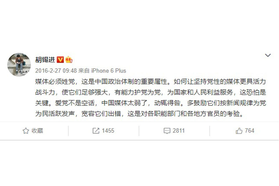 The editor of the Global Times Hu Xijin has previously called for greater space for public discussion. In a Weibo post he has said ‘China should open up more channels for criticism and suggestions and encourage constructive criticism’.