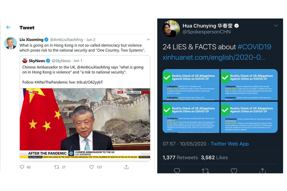 In the UK the Chinese Ambassador, Liu Xiaoming, and his deputy, Chen Wen, regularly appear on the BBC and other broadcasters to discuss the problems Hong Kong has faced. Chinese diplomats and officials also freely discuss Hong Kong on Twitter or challenge the validity of claims on other issues such as COVID-19 and are not censored.