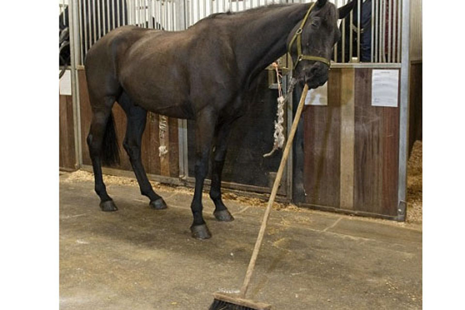 A military horse from the Household Cavalry has taken it upon himself to help muck out his own yard during the morning mucking-out parade.