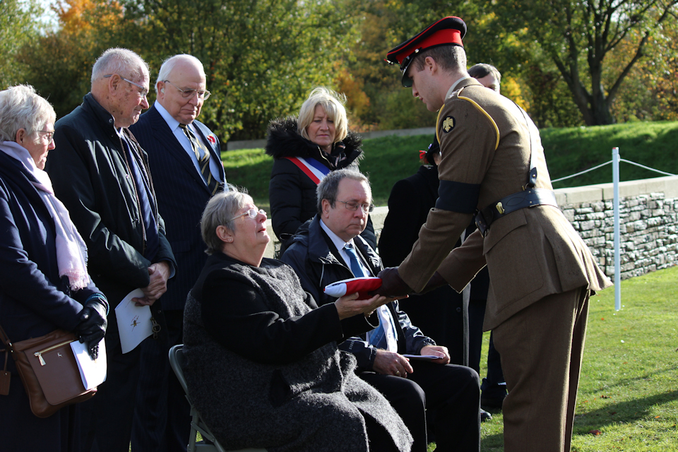 Lieutenant Piers Darby gives the Union Flag to Linda Cook, granddaughter of Lance Corporal Perkins. JCCC copyright.