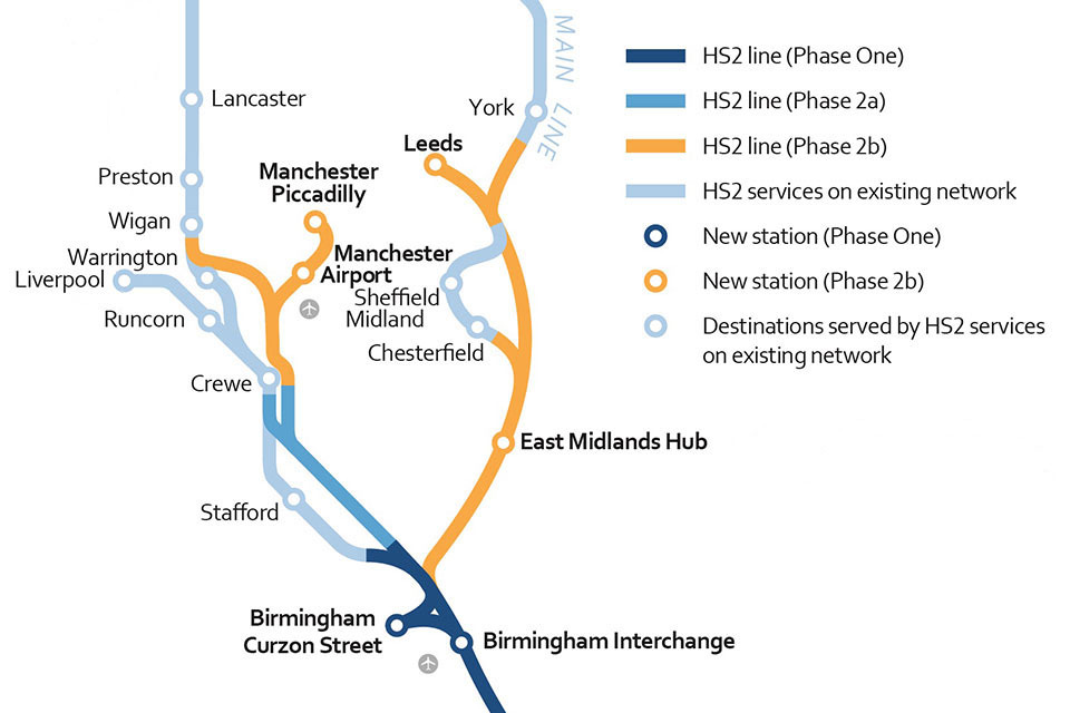 Confirming high speed rail lines between Birmingham, Manchester, Liverpool, Leeds, Sheffield and the East Midlands.