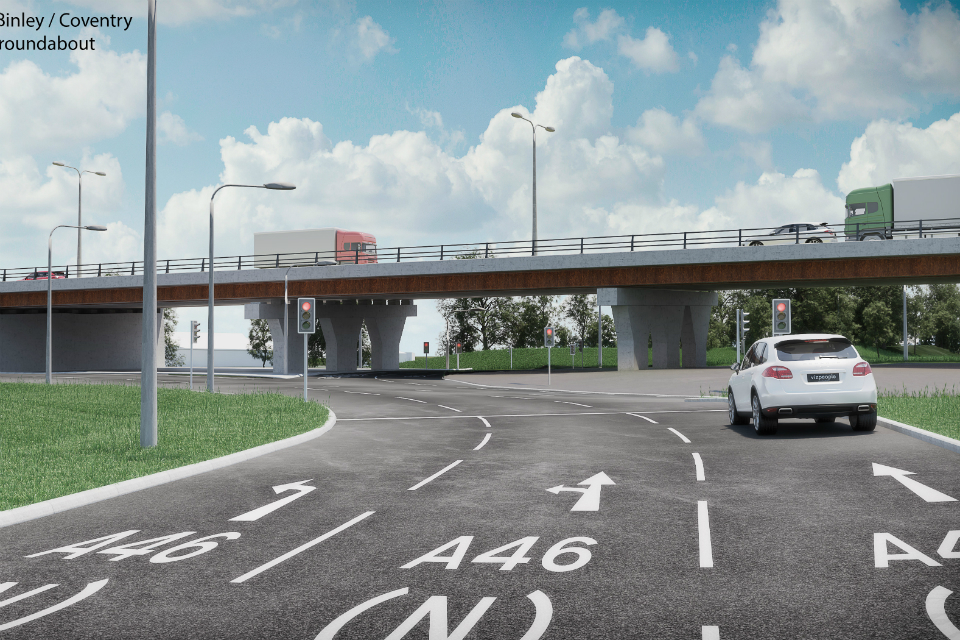 The plans for the Binley junction will see the A46 dual carriageway become a flyover that will separate local traffic from using the A46. This will mean that trunk road traffic will not need to pass through the roundabout and will benefit from shorter journey times. It will also be easier for local traffic to navigate the roundabout as there will be less traffic using it.