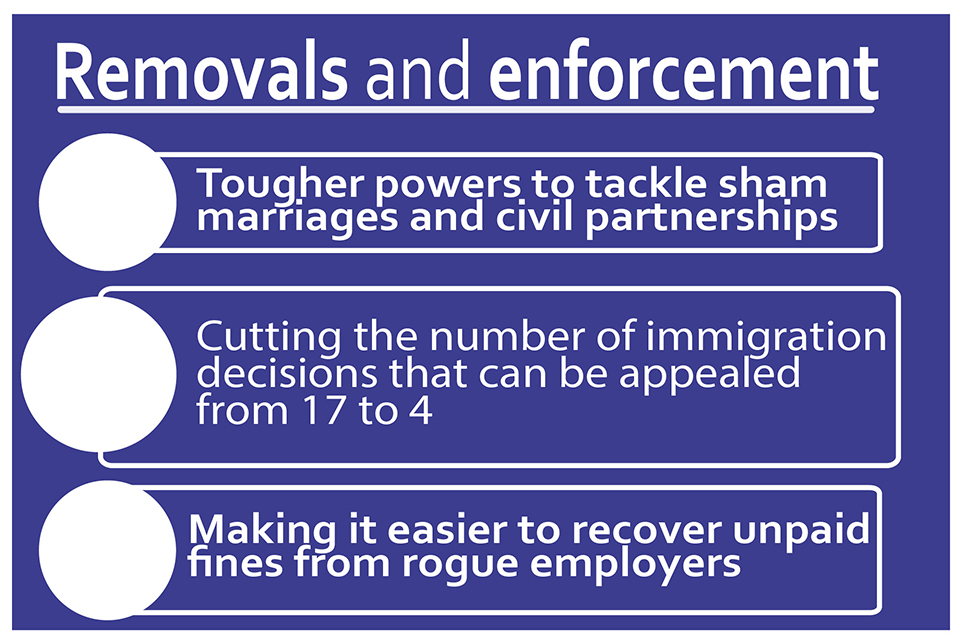 It also continues the Home Office’s work to reduce net migration by focusing on eliminating immigration abuse, including removing from the UK those with no right to be here and preventing others from entering.