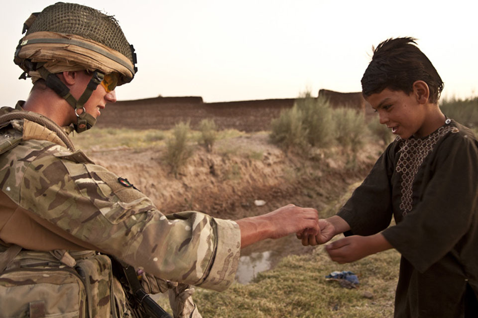 Highlander Mark Mackenzie, 4 SCOTS, gives an Afghan child a treat during a patrol in Lashkar Gah District, Helmand province [Picture: Petty Officer 2nd Class Jonathan Chandler, US Navy/ISAF 2011]