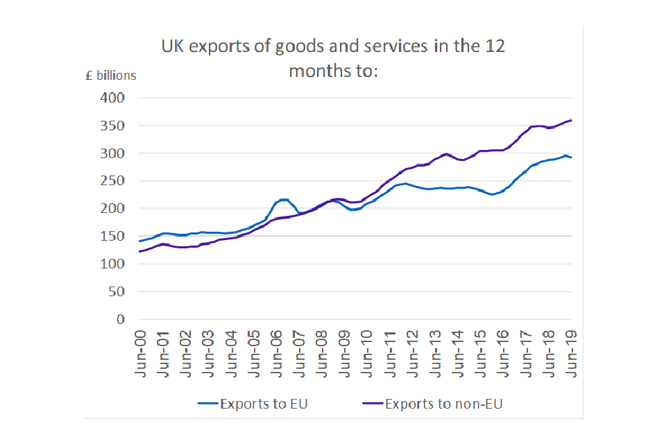 In the run up to October 31, exports to non-EU countries are growing twice as fast than those to the bloc, driven in large part by major non-EU trading partners including the USA and China, with total trade with the USA surpassing £200 billion for the first time.
