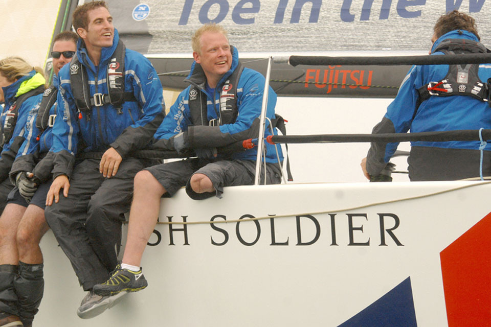 Private Dean Caudley (centre), who lost his left leg in a roadside bomb incident in Afghanistan, competing at Cowes Week aboard the Army Sailing Association yacht, 'British Soldier' [Picture: Chris Fletcher, Crown Copyright/MOD 2010]