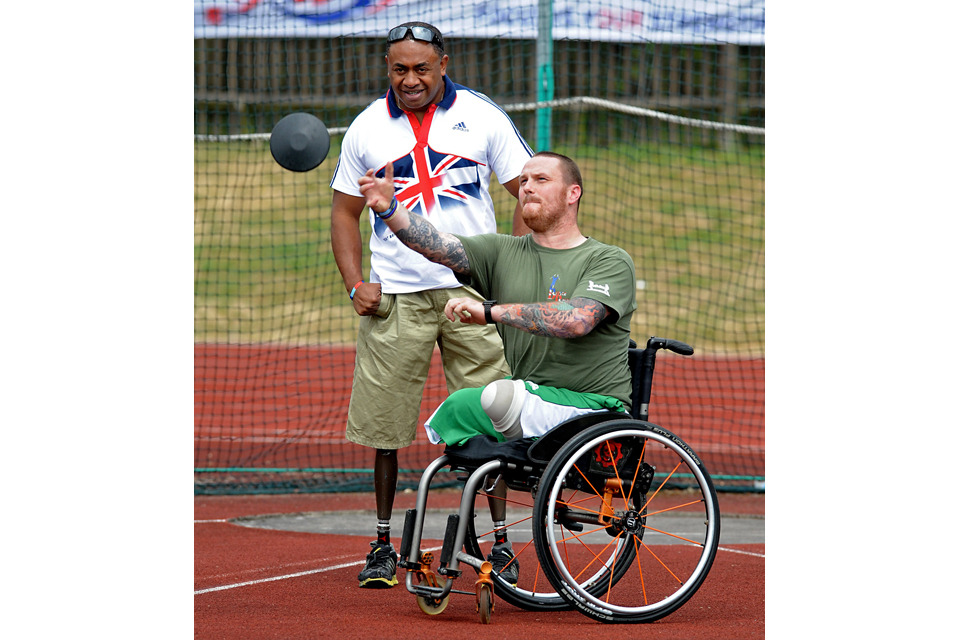 Lance Corporal Derek Derenalagi gives a lesson in discus throwing to double amputee Sapper Clive Smith [Picture: Richard Watt, Crown copyright]