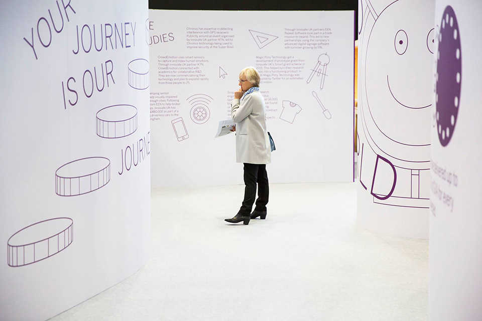 Innovate UK's stand describes the journey a business takes when trying to commercialise an innovative idea and shows how Innovate UK can provide support along the way.