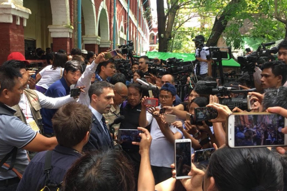 British Ambassador to Burma Dan Chugg giving a statement in the middle of a crowd.