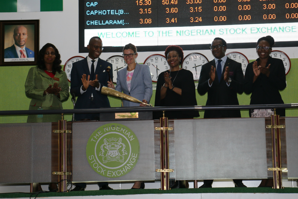 Deputy High Commissioner to Nigeria Laure Beaufils ringing the stock bell at the Nigerian stock exchange