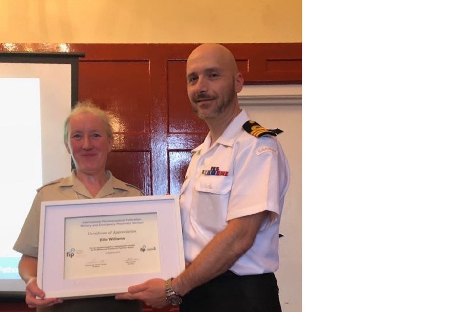 Lt Col Ellie William’s receiving a Certificate of Appreciation’ from the Federation Internationale Pharmaceutique (FIP). MOD Crown Copyright.