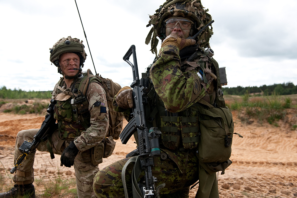 A British soldier liaises with an Estonian anti-tank section commander during a NATO training exercise [Picture: Specialist Joshua Leonard]