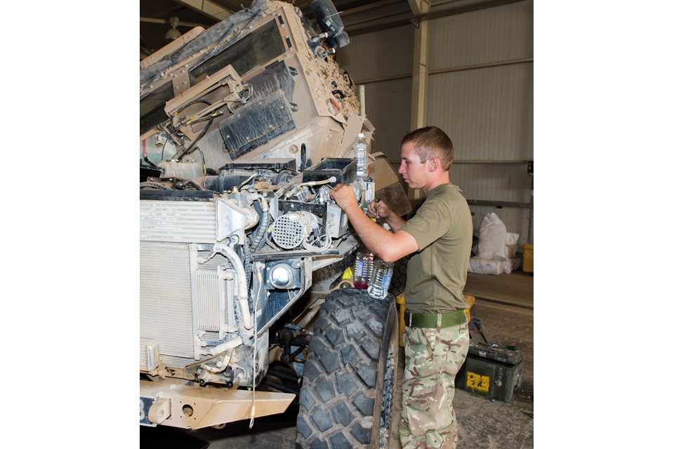 A mechanic works on a Foxhound armoured vehicle [Picture: Corporal Jamie Peters, Crown copyright]