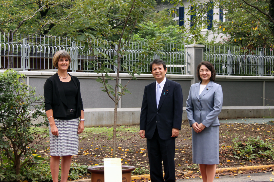 Closing the ceremony, State Minister Miyashita and Chargé d’Affaires Longbottom posed for a photo with a taihaku cherry tree planted by HRH The Duke of Cambridge during his first visit to Japan in February 2015. Ms Toshiko Takeya, the Parliamentary Vice-Minister of Finance, joined the photo session.