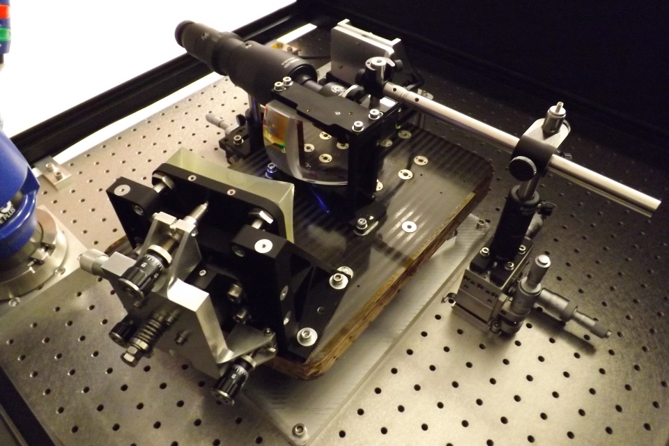 The CompAQS spectrometer is under development at the Space Research Centre at University of Leicester and is a compact instrument to measure air quality for space. The optical grating can be seen to the right of the picture, which is used to split sunlight reflected from the Earth into the different spectral colours, from which the amount of nitrogen dioxide can be measured.