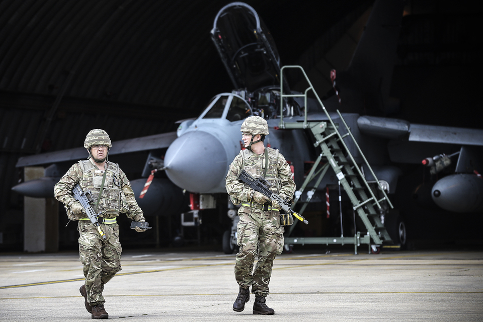 An airman from 31 Squadron stands guard in front of a Tornado GR4 aircraft [Picture: Corporal Andy Holmes RAF, Crown copyright]