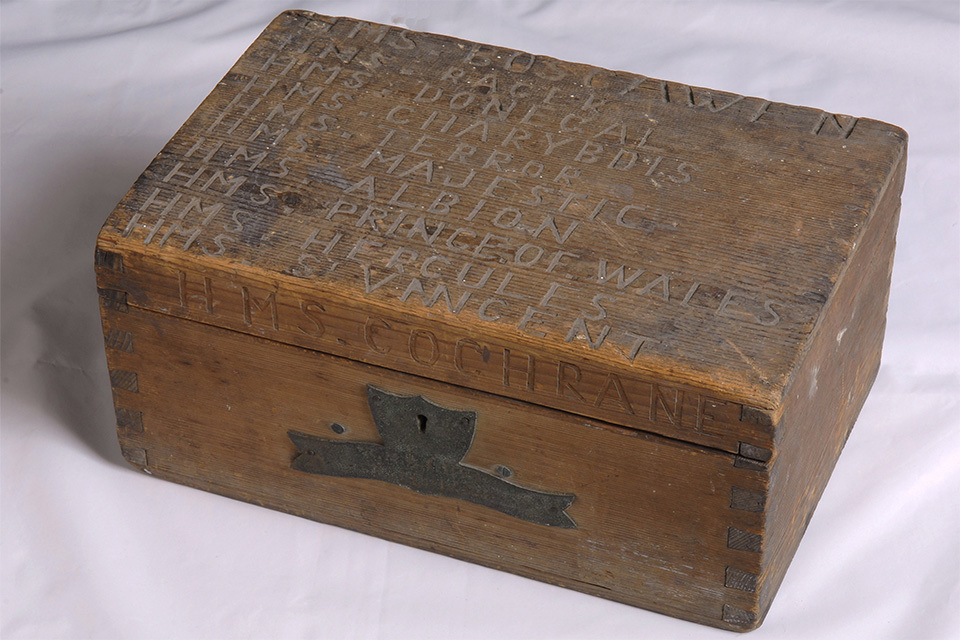 Ditty box owned by Sergeant Edward Furlong Royal Marines Light Infantry. He served between 1901 and 1927 and used this ditty box throughout his career. It has been crudely engraved with the ships he served on during this time. (Credit: National Museum of the Royal Navy)