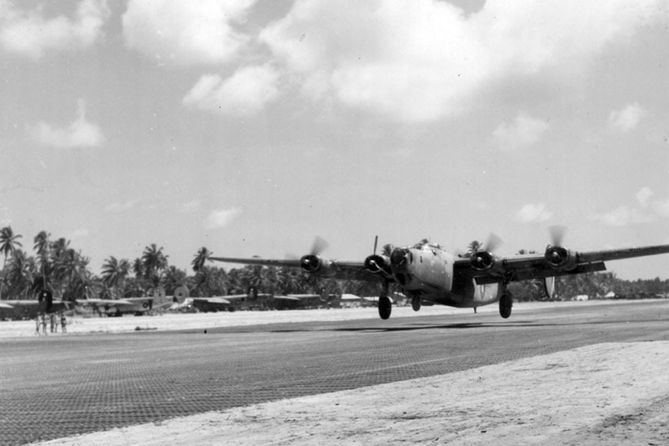 A Consolidated Liberator B Mark VI of 356 Squadron landing on three engines at Brown's West Island in the Cocos Islands after completing a sortie on 6 August 1945 [Picture: Crown Copyright/MOD 1945]