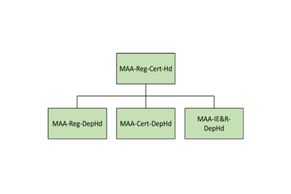 The international engagement & recognition reporting structure. Lead by MAA-Reg-Cert-Hd with MAA-Reg-DepHd, MAA-Cert_DepHd and MAA-IE&R-DepHd.