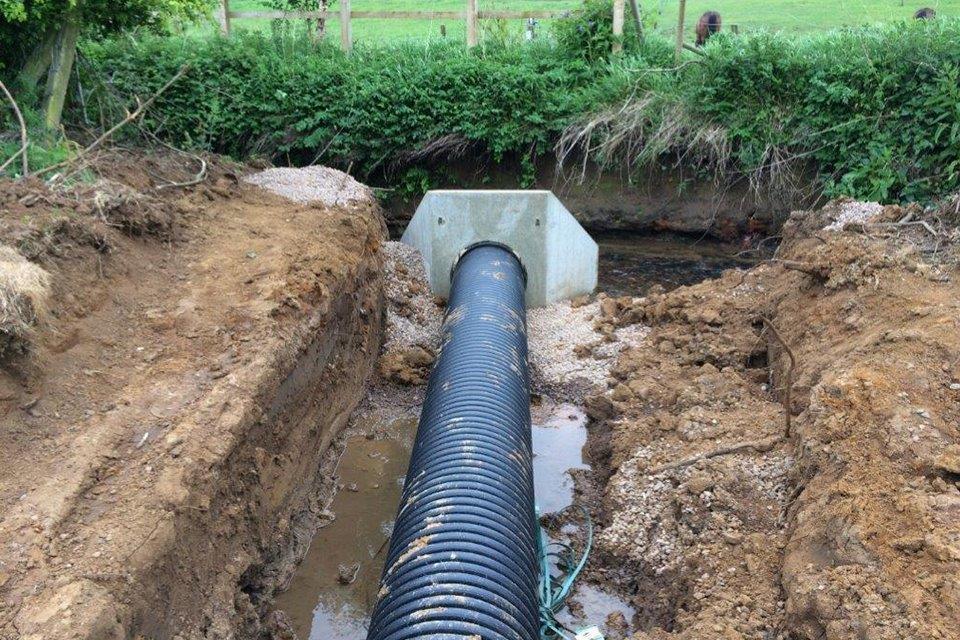 The work, which was completed last year, has seen the installation of large diameter twin-walled pipes, manhole chambers and a pre-cast headwall. Together these divert surface water flows from the adjacent farmland into the brook, by-passing the wet-well at the pumping station. This is preventing flooding of the access track to the scheme as well as land owned by 2 landowners.