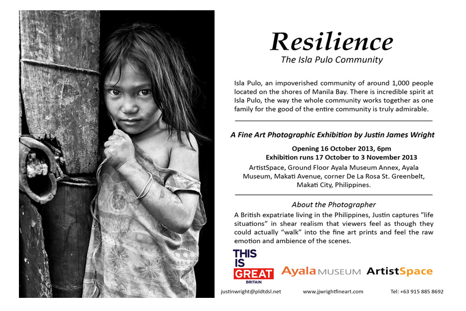 “Resilience: The Isla Pulo Community” opens at 6pm on October 16, 2013, and runs from October 17- November 3, 2013. Through a series of poignant, fine art photographs, the exhibit takes you into the heart of the people of Isla Pulo – an impoverished community of roughly 1,000 people – on the shores of Manila Bay.