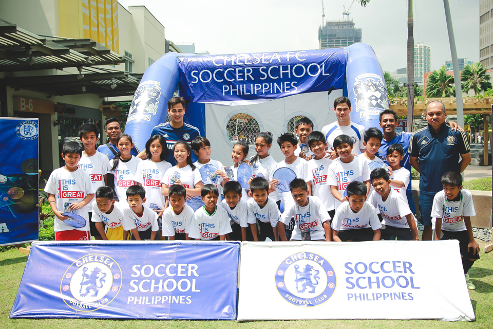 Group photo of the members of the Chelsea FC Soccer School Philippines including Azkal Players Phil and James Younghusband and the children who participated in the football drills