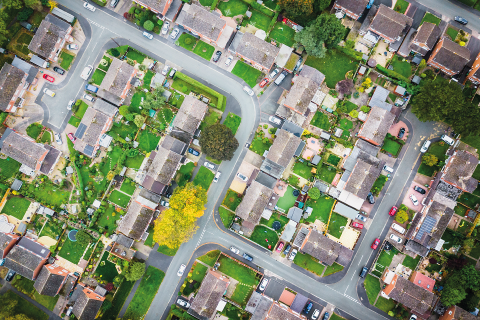 Satellite image style aerial view of homes on an English housing estate. [Credit: K303/Shutterstock.com]