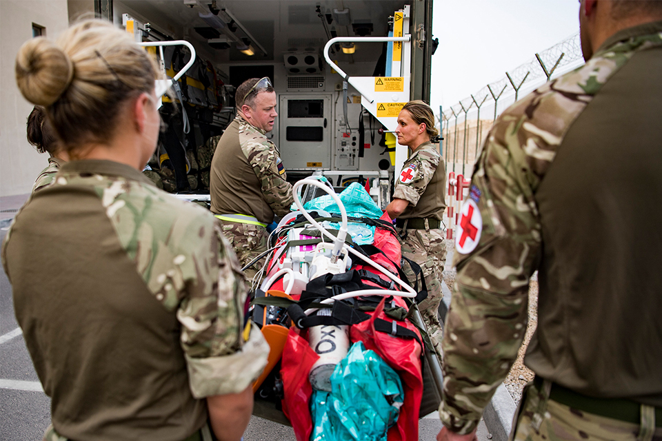 Members of the Joint Medical Group prepare to transfer a simulated casualty to a waiting ambulance © MOD Crown Copyright
