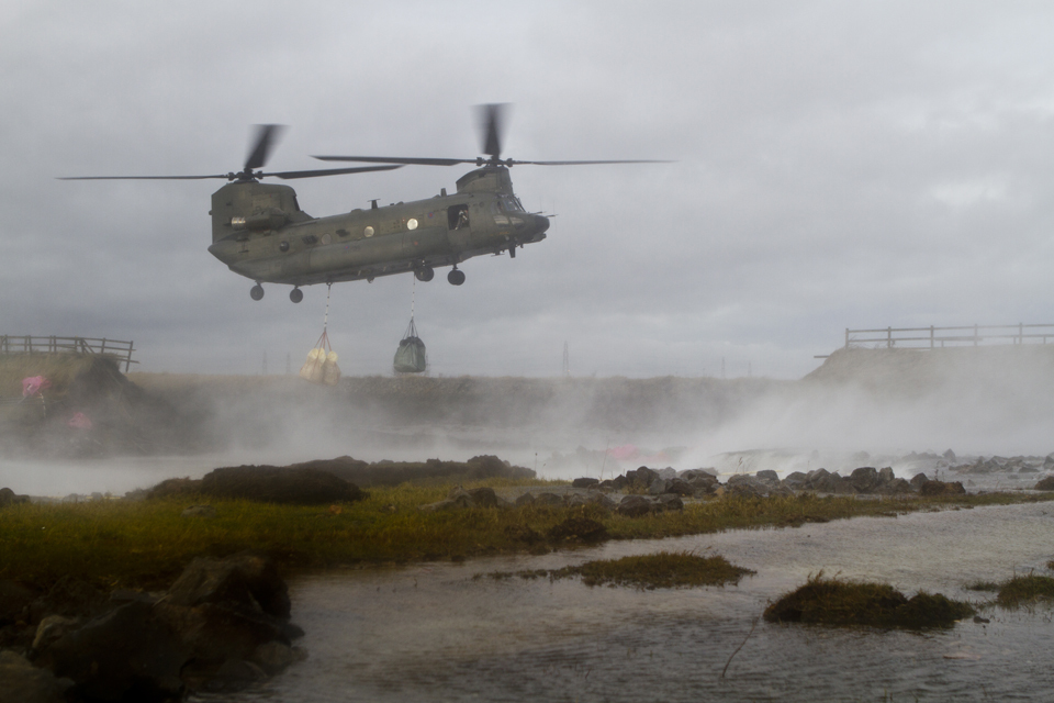 A Chinook from RAF Odiham supporting the Environment Agency in carrying out repairs to east coast flood defences [Picture: Corporal Jimmy Wise RAF, Crown copyright]