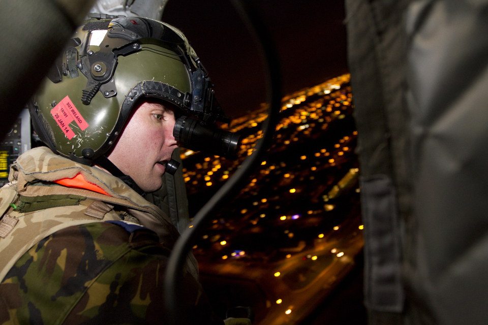 Sergeant Ireland, from 18 Squadron, looks through night-vision goggles for a suitable landing zone [Picture: Corporal Jimmy Wise RAF, Crown copyright]