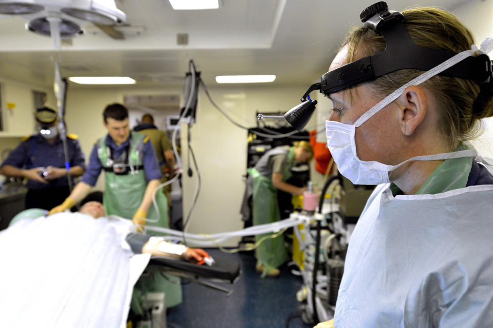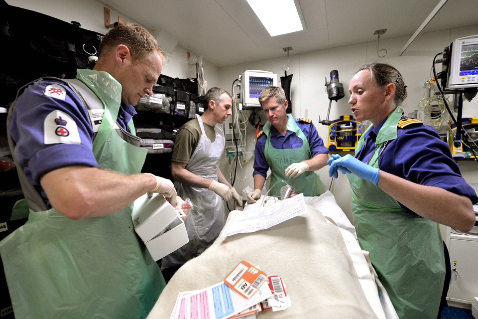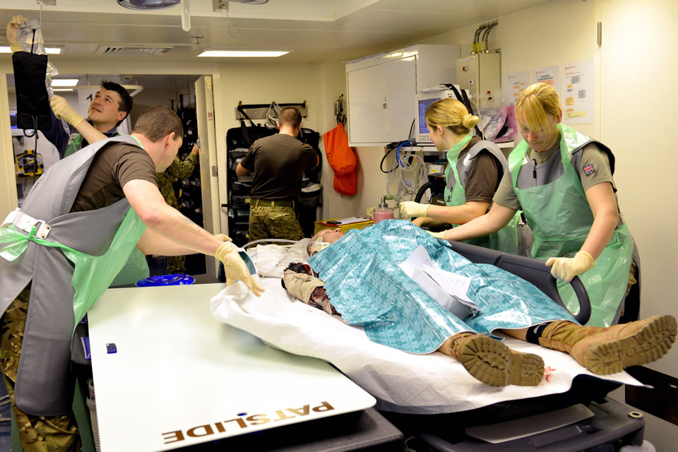 Medics in action in RFA Cardigan Bay's sick bay [Picture: Petty Officer (Photographer) Paul A'Barrow, Crown copyright]