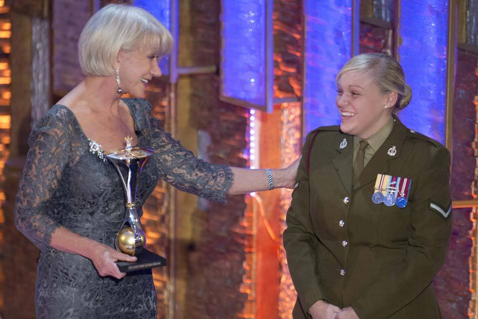 Lance Corporal Hayley Ridgeway receives her award from Helen Mirren at the 2012 awards ceremony [Picture: Arthur Edwards, Copyright The Sun]