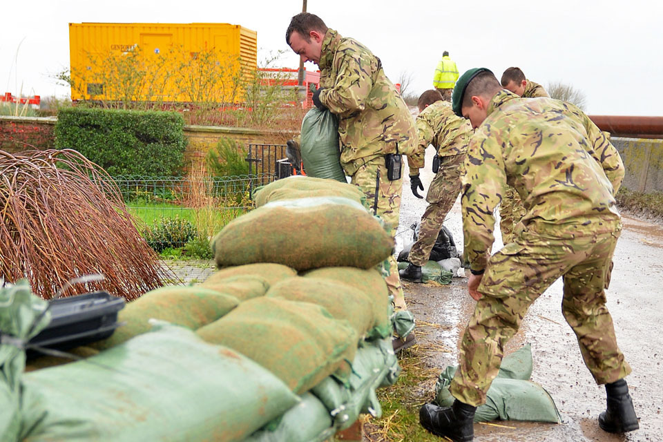 Royal Marines from 40 Commando are moving and filling sandbags in Somerset, and troops from 39 Engineer Regiment are using 8 earth-moving vehicles to assist the Environment Agency with rebuilding the shingle flood defences at Chesil Beach in Dorset.