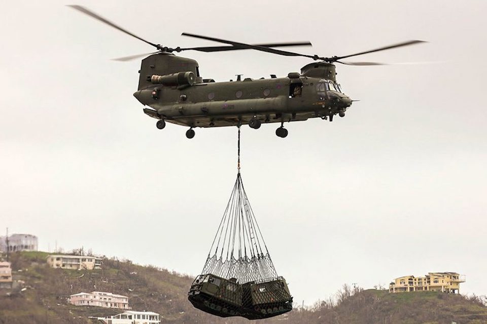 One of the UK Chinooks undertaking relief work in the Caribbean in the aftermath of Hurricane Irma.