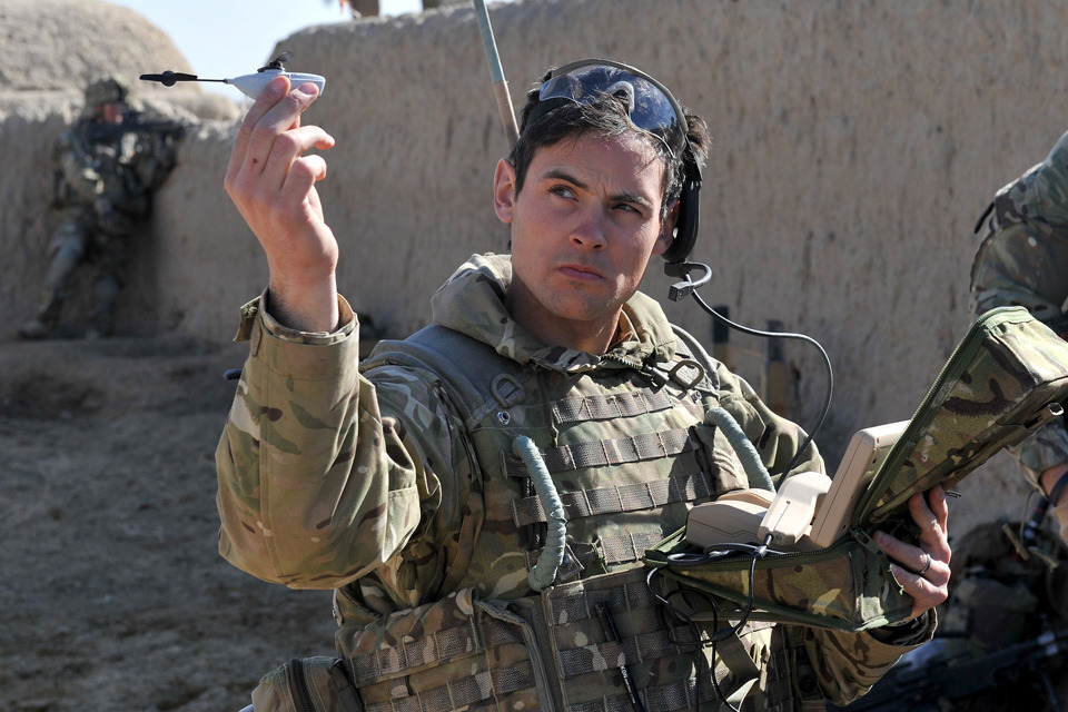 Sergeant Scott Weaver launches a Black Hornet Nano Unmanned Air Vehicle from a compound in Afghanistan [Picture: Sergeant Rupert Frere RLC, Crown Copyright/MOD 2013]