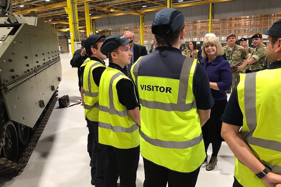 Defence Minister Harriett Baldwin met with apprentices working on the Ajax programme at the factory in Merthyr Tydfil.
