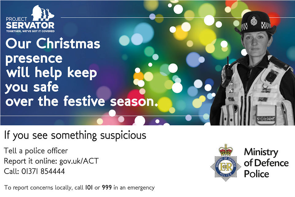 The ongoing use of Project Servator tactics by the Ministry of Defence Police (MDP) supports the objectives of the ACT festive campaign using community engagement, to encourage vigilance, as part of its unpredictable and highly visible deployments in and around the sites that it protects across the UK. Officers pop up at a range of locations including the busy public areas surrounding Defence HQ in Whitehall and the Naval Base in Portsmouth.