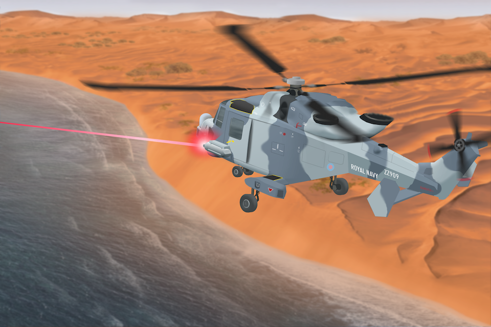 Computer Generated Image illustrating the use of DEW on a Wildcat helicopter. Crown copyright.