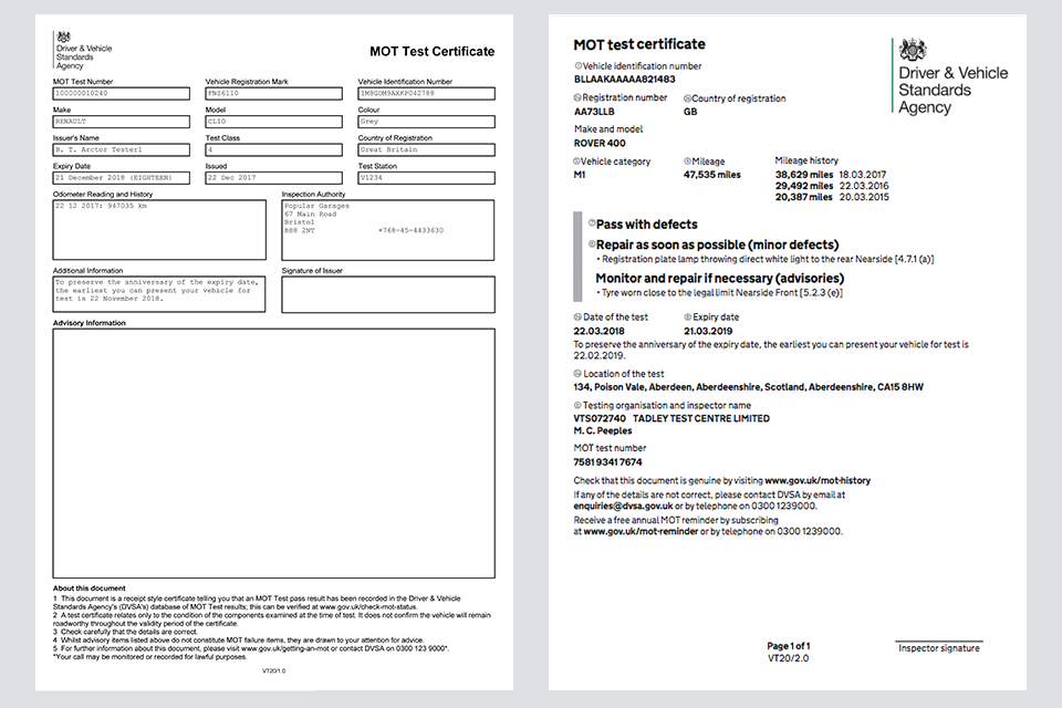 The old MOT test certificate (left) has changed to a new style (right) to list the new types of defects.