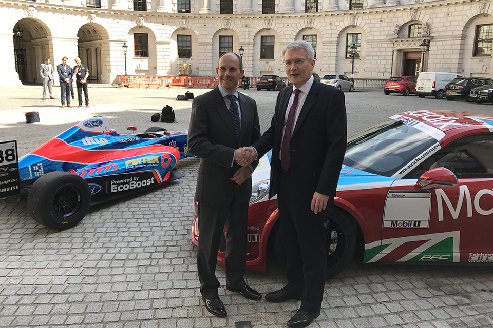 Roads Minister Andrew Jones and Ben Taylor, Managing Director, International Motor Sports, with a Mygale-Ford Formula 4 car and a Porsche 911 GT3 Cup race car.