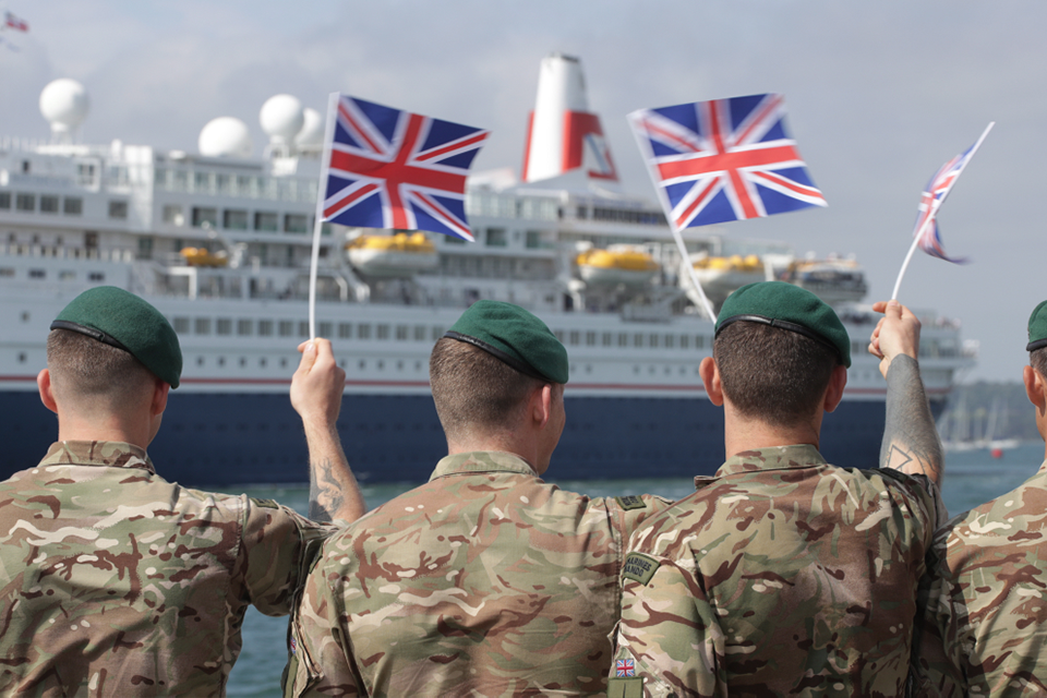 A group of Royal Marines, the Corps of which Corporal Cameron was a member, wave Union Flags as the MV Boudicca departs Poole Harbour on a nine-day commemorative tour as part of 2019 D-Day commemorations. MOD Crown Copyright.