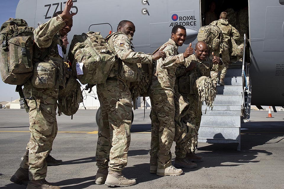 Personnel based at Kandahar Air Field head back to the UK on a Royal Air Force C17 Globemaster aircraft in November 2014. [Picture: Corporal Andrew Morris, RAF. Crown Copyright]