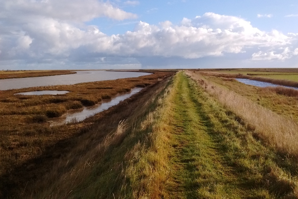 Picture shows path running along raised bank between flat lowlands with areas of water on both sides, at the end of which stands a lone walker