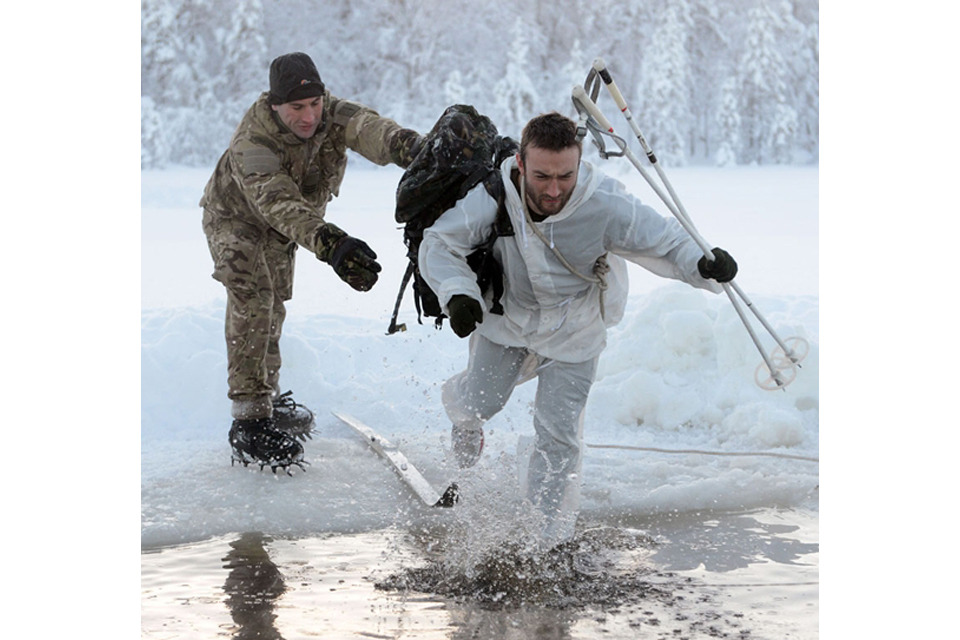 A member of 845 Naval Air Squadron is guided on how to negotiate a freezing pool of water [Picture: Crown Copyright/MOD 2013]